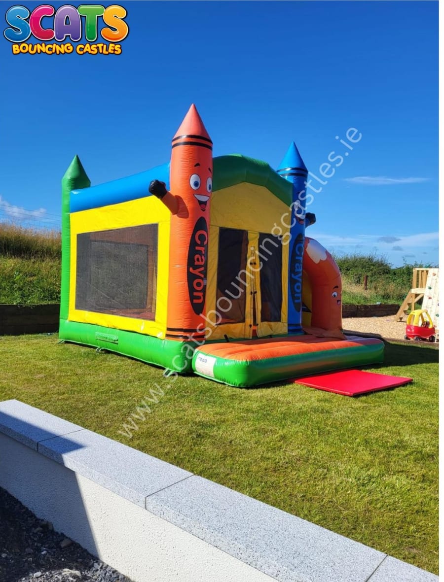 Add a splash of colour to your next party or event with our crayon themed combi unit which has a generous bouncing area & a slide on the side.