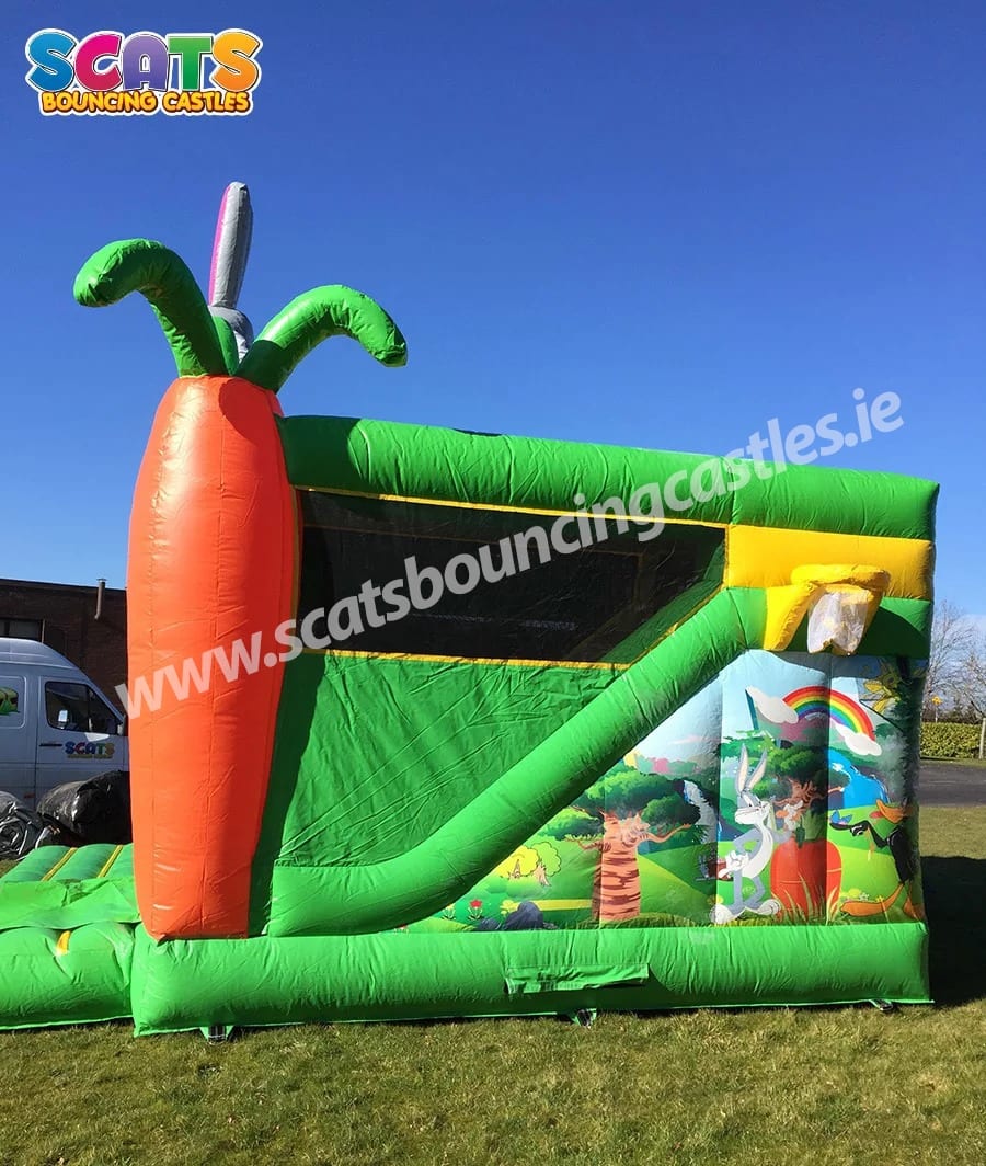 size: 18ft x 15ft Brand New to Scats Bouncing Castles! Our Buggs Bunny combi features a big Buggs' head on top, a huge carrot to the side and also a fantastic Buggs Bunny artwork on the wall! It will definitely be popular with all the Looney Tunes fans out there.Our new combi consists of a generous bouncy area, a slide to the side and there also is a basket ball hoop for a little extra fun! You don't have to worry about the weather on the day, because this combi is fully covered and it also has supervision nets so you always can keep your eye out on the kids!