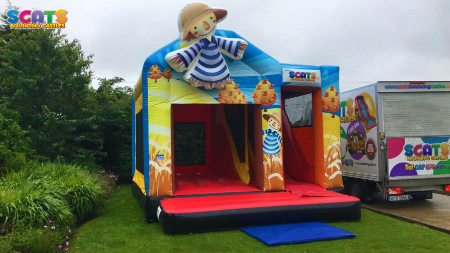 size: 15ft x 18ft The Scarecrow themed combi unit has a bouncy castle which consists of a large bouncy area, a slide to the side. It is digitally printed with images of Scarecrows & golden fields. It is suitable for 2 years up and has supervised netting all round so you can keep an eye out on the kids. This unit is fully covered, so don't worry about the rain! This castle will guarantee your party will be a success. It is suitable for girls and boys.