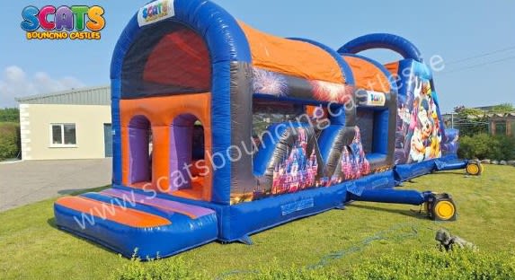 It contains a large entrance which leads to 2 lanes full of tunnels, pop up obstacles, inflatable tubes & lots of bouncing space.