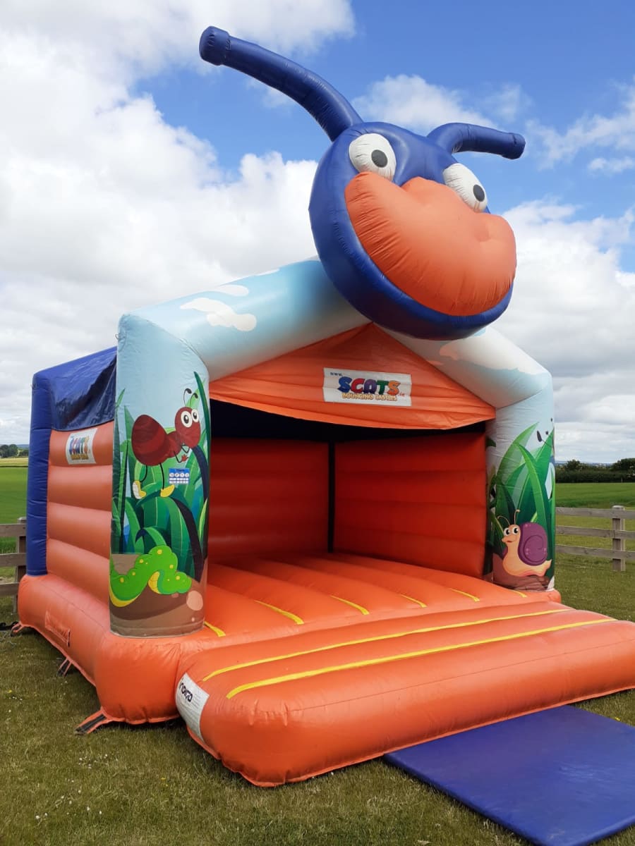 The Bugaroo bouncy castle features a giant bug head on top of the castle - he will be seen for miles!