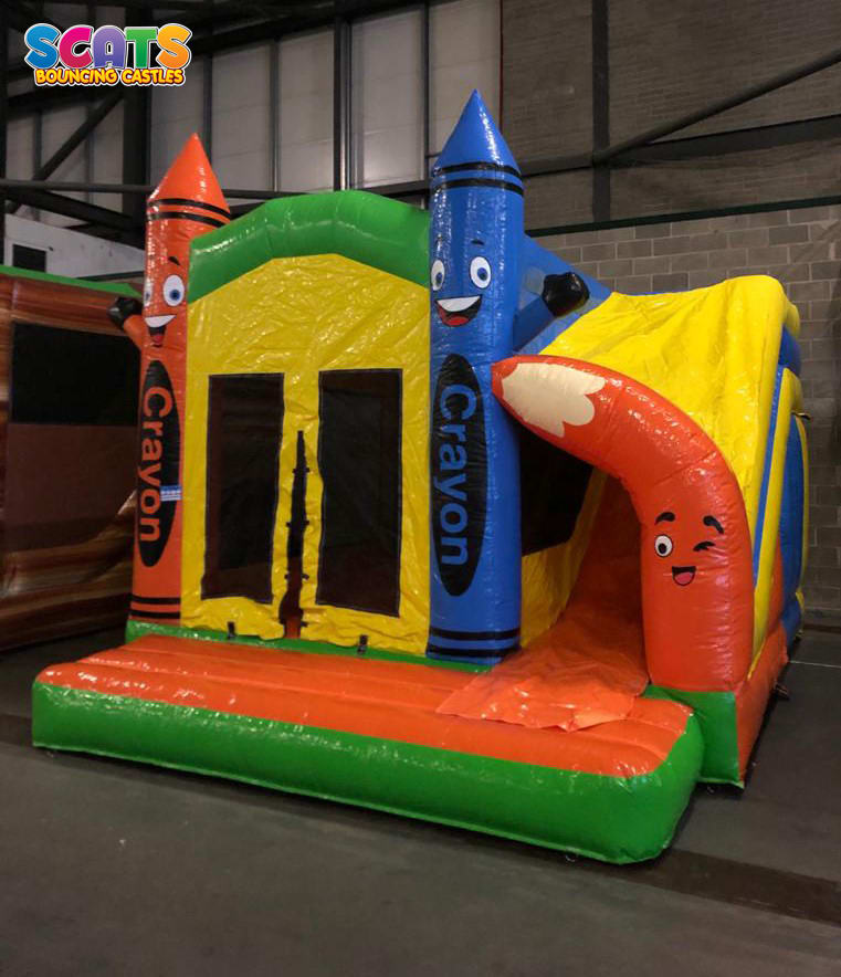 Add a splash of colour to your next party or event with our crayon themed combi unit which has a generous bouncing area & a slide on the side.