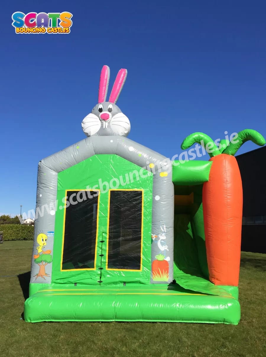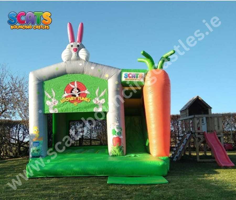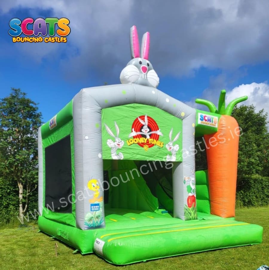 size: 18ft x 15ft Brand New to Scats Bouncing Castles! Our Buggs Bunny combi features a big Buggs' head on top, a huge carrot to the side and also a fantastic Buggs Bunny artwork on the wall! It will definitely be popular with all the Looney Tunes fans out there.Our new combi consists of a generous bouncy area, a slide to the side and there also is a basket ball hoop for a little extra fun! You don't have to worry about the weather on the day, because this combi is fully covered and it also has supervision nets so you always can keep your eye out on the kids!