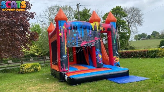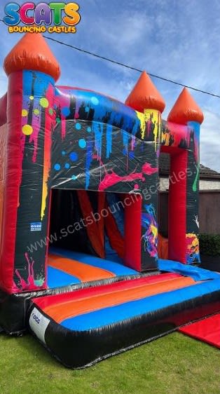 Our Paint Splat -themed bouncing combi unit features a fully enclosed spacious bouncing area with a slide to the side for added fun. . Don't miss out on our great selection of combi units for hire—add a little extra flair to your party and book with Scats today!