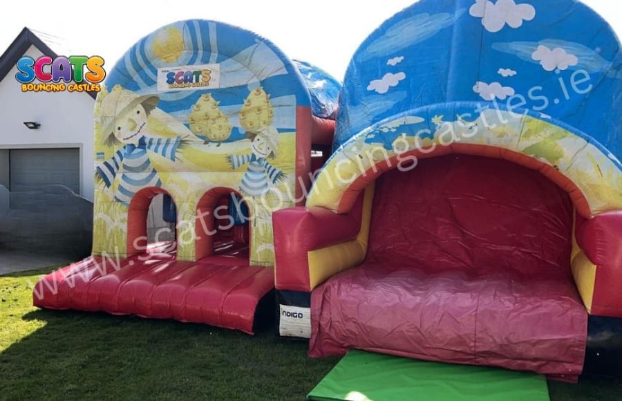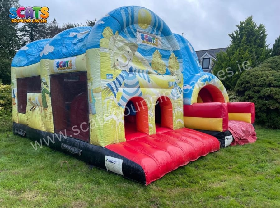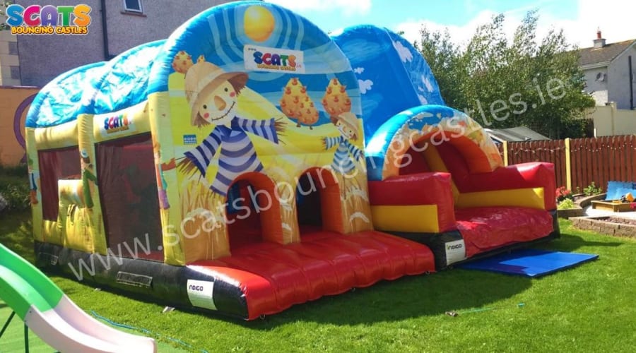 Large enclosed side by side obstacle, fully covered with eye catching Scarecrow themed digital print design. The course includes an Arch entrance, jump through area, tunnells, pop-up tubes and the all important slide to finish. This unit has visibility netting for light and ease of supervision. It is suitable for both boys and girls.