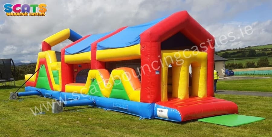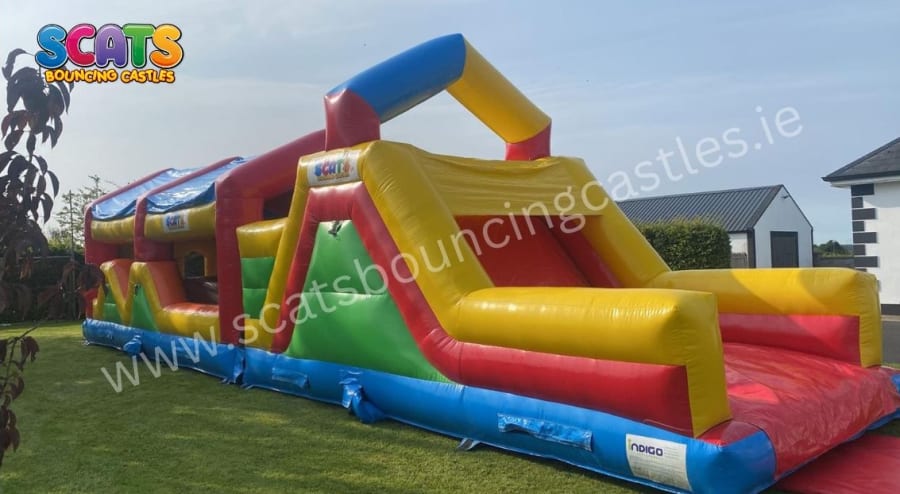 Check out our Brand new Apex style multi coloured obstacle course. This Rock Climbing Obstacle Course is a two lane climbing obstacle whereby you enter the unit at the back through a series of inflatable pillars over the climbing wall, through the tunnels and then faced with a high climbing wall up to the top and then slide down the steep slide. This is hugely popular with older children. Suitable for Fun Days, Sports Days, Communions, Confirmations, Birthday Parties and much more.
