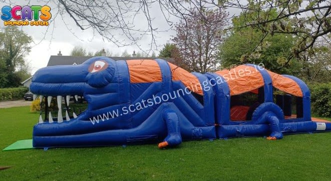 Featuring a bish-bash area, a bouncy haven, a rock climbing wall, and a thrilling slide, this obstacle course is packed with endless thrills and excitement. Fully covered with safety netting on each side for easy supervision, it's suitable for kids of all ages, making it the perfect addition to any birthday party, communion, confirmation, school day, sports day, and more!